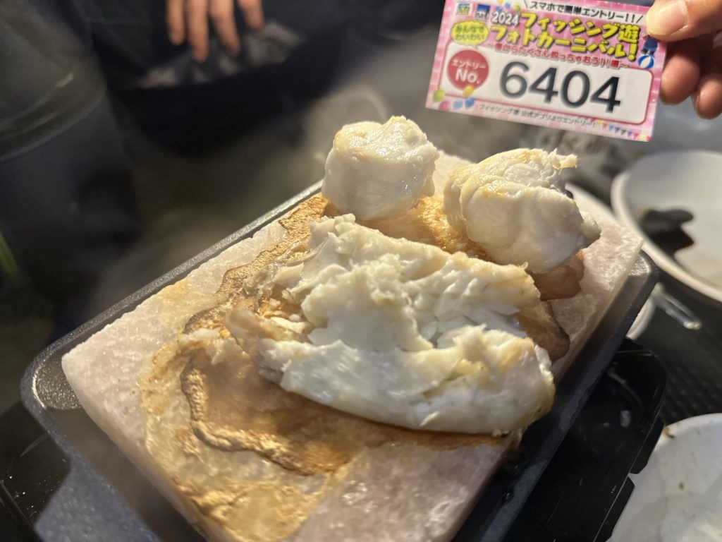 岩塩プレートの塩で至高の焼きフグとなりました。